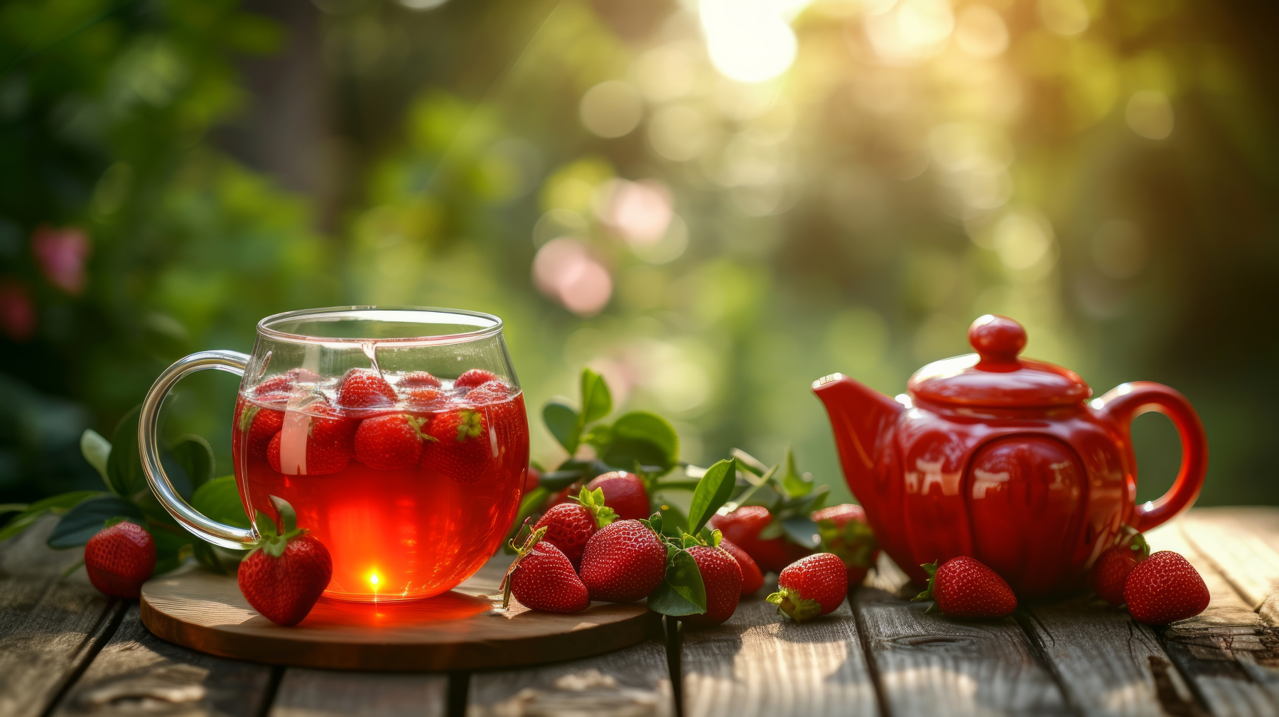 A transparent glass cup with strawberry tea stands on a wooden table.